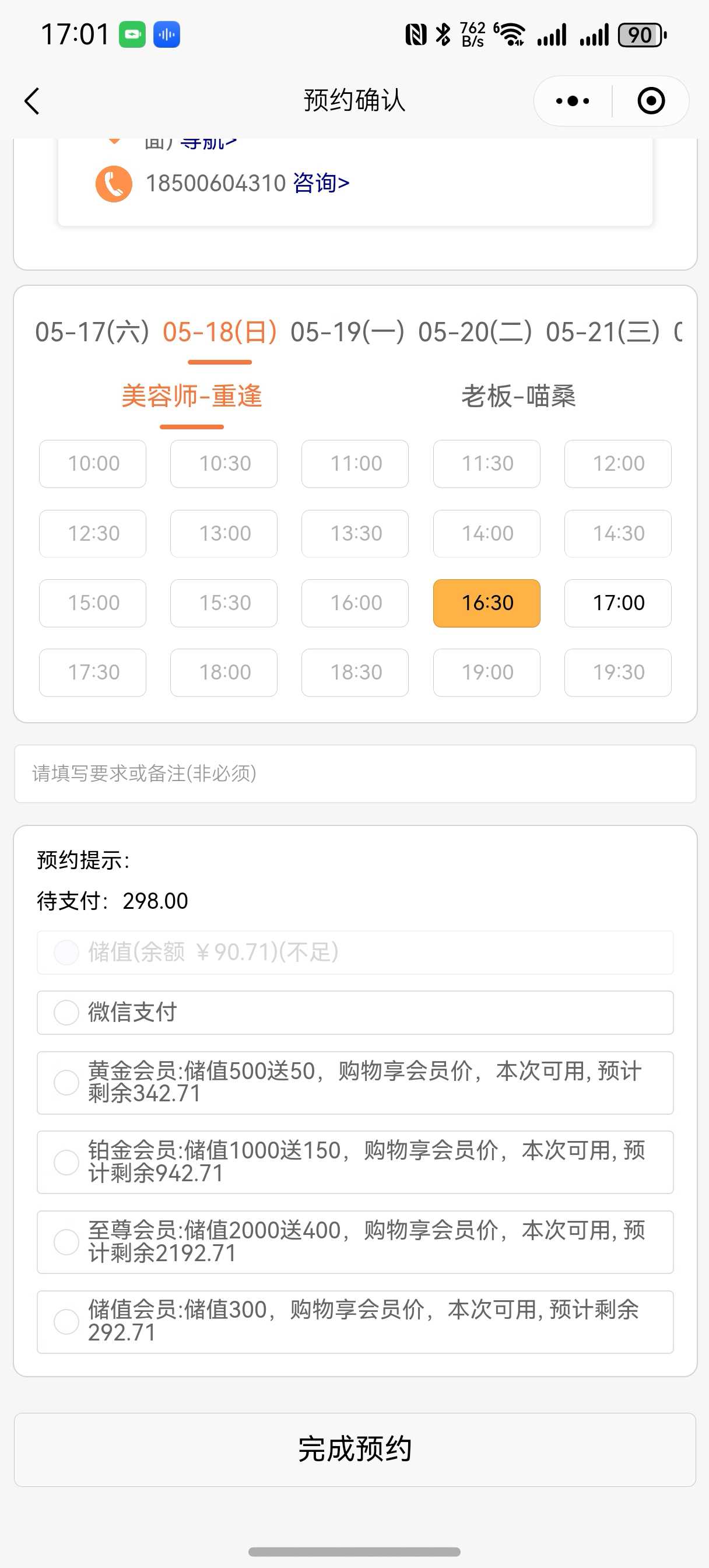 - 顾客预约时,按会员体系,进行打折或享受会员价