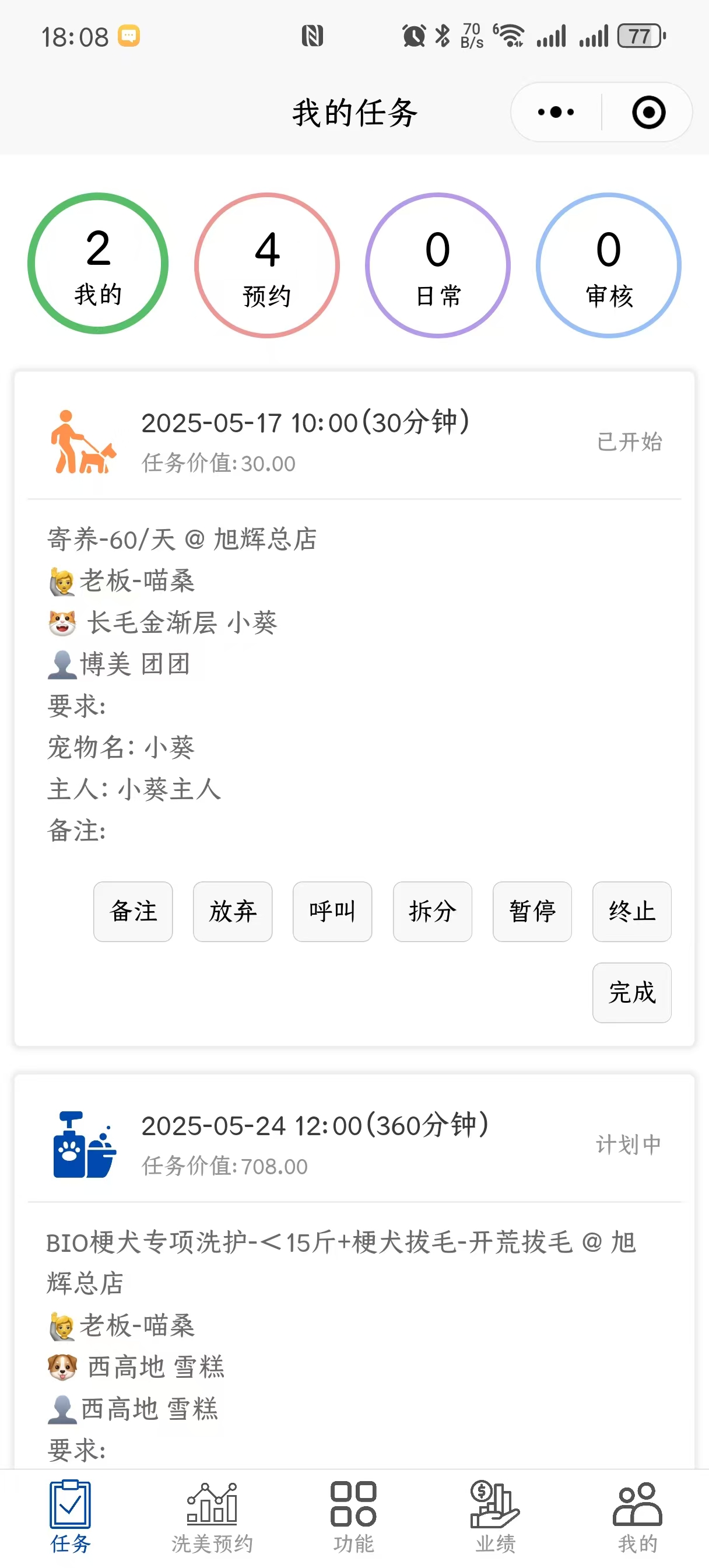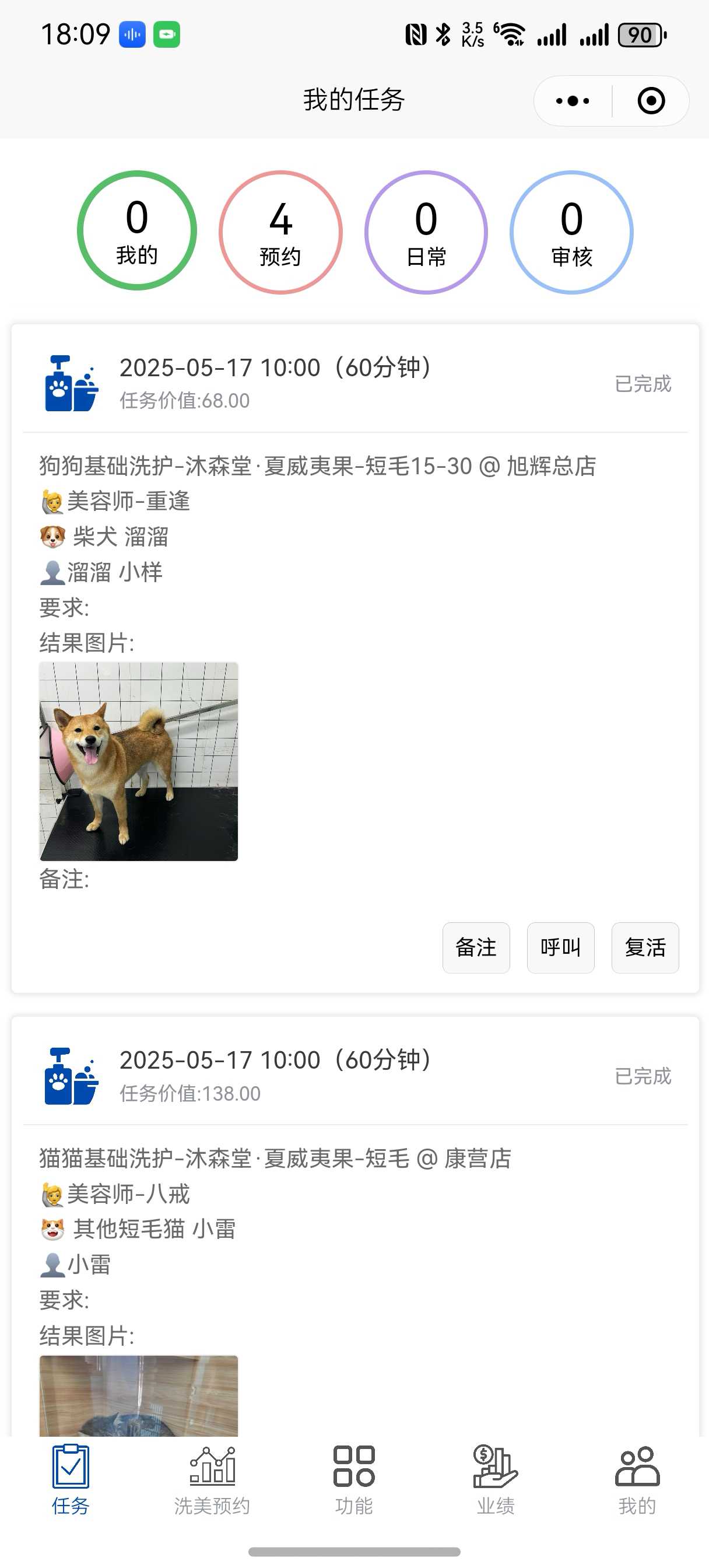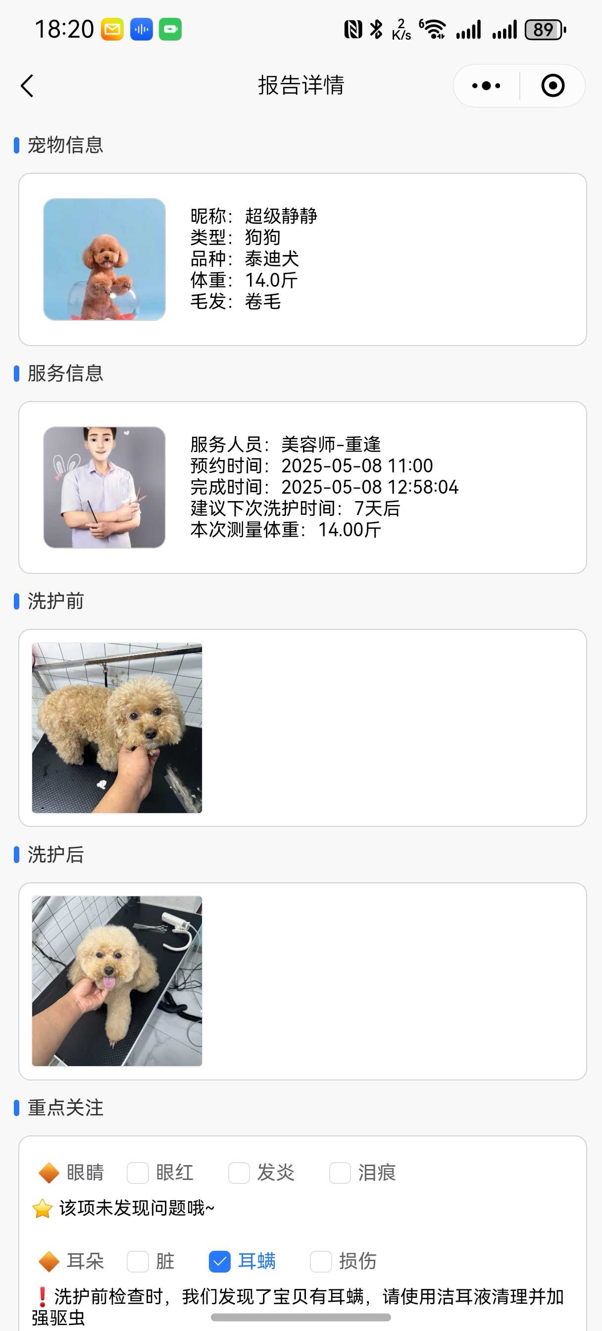 预约的美容,会出现在美容师的任务中。在开始和结束时,需要填写洗护情况,完成时自动生成报告。