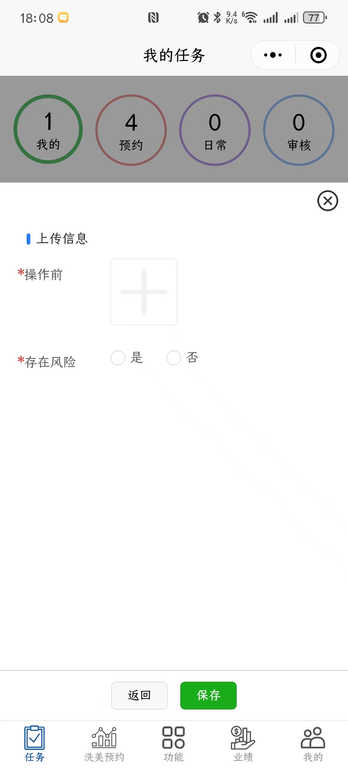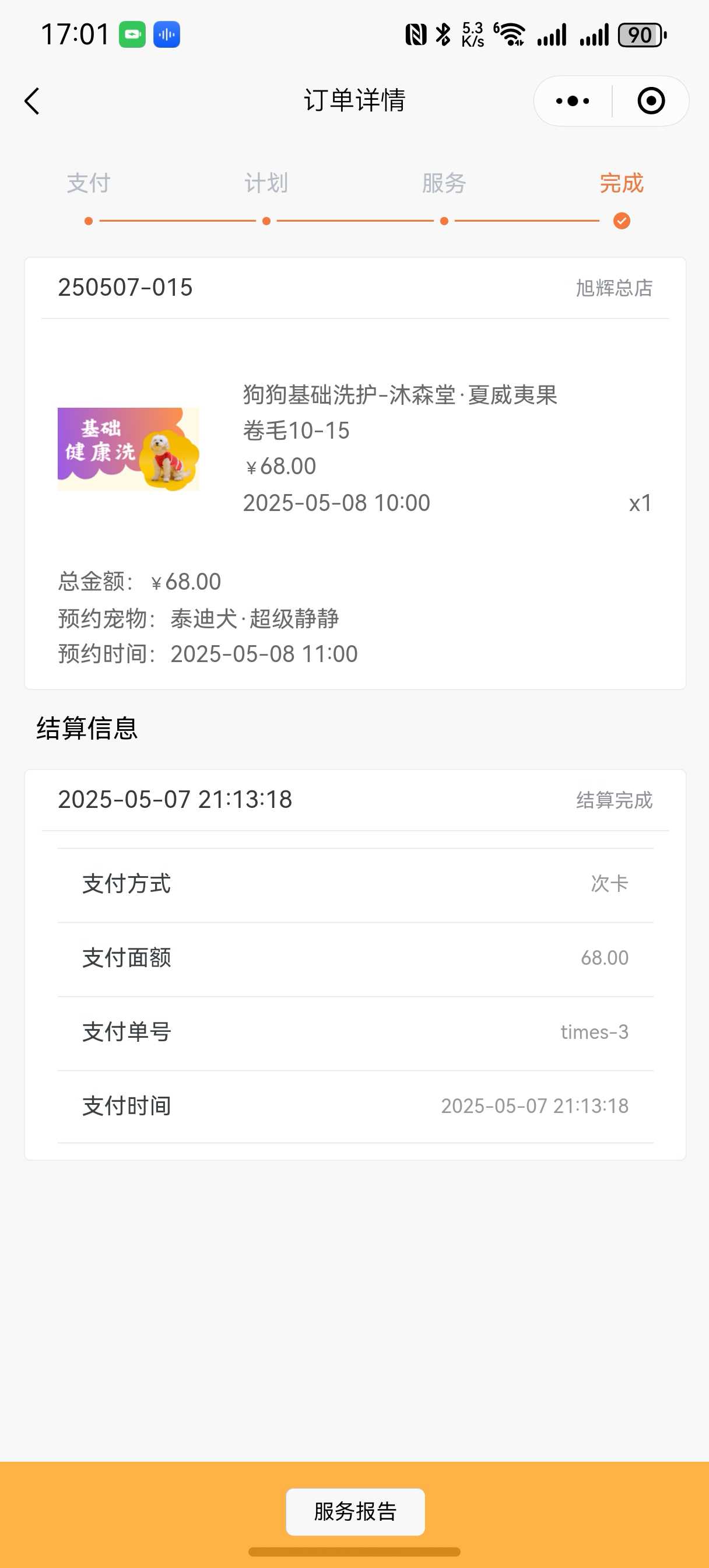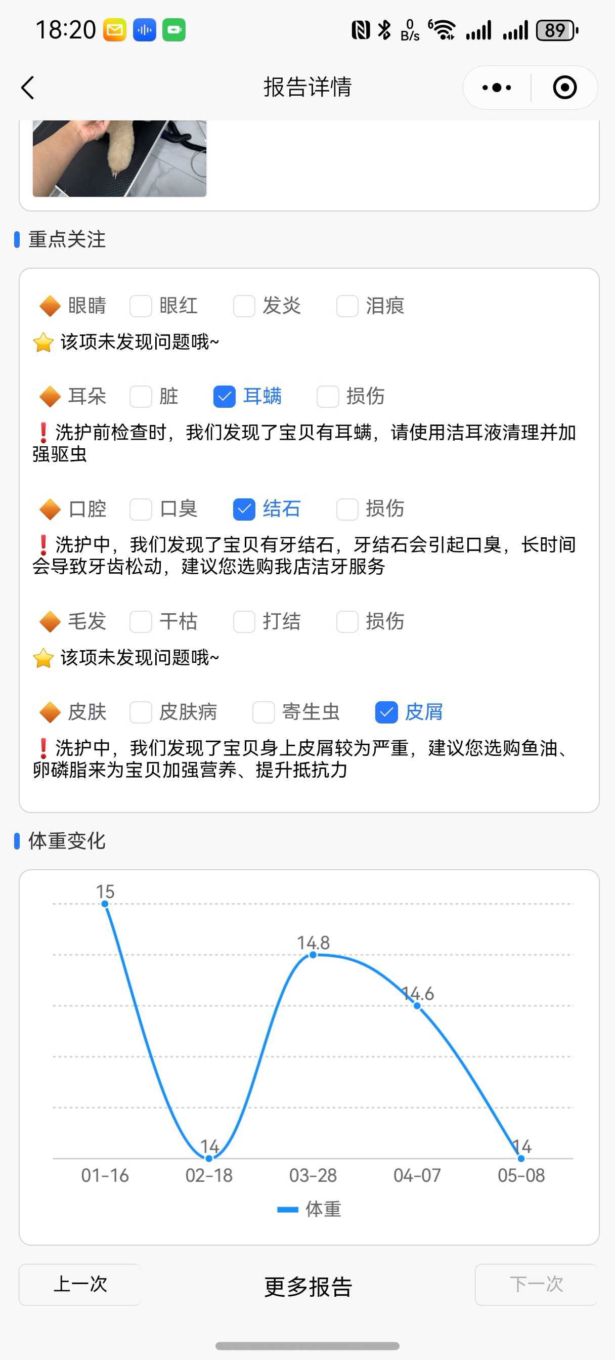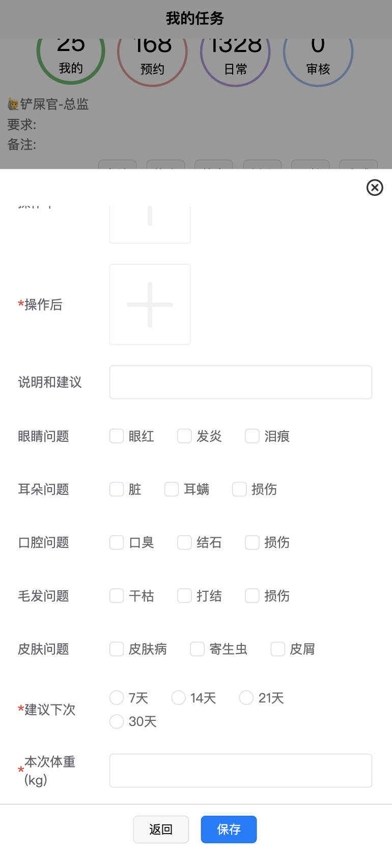 预约的美容,会出现在美容师的任务中。在开始和结束时,需要填写洗护情况,完成时自动生成报告。