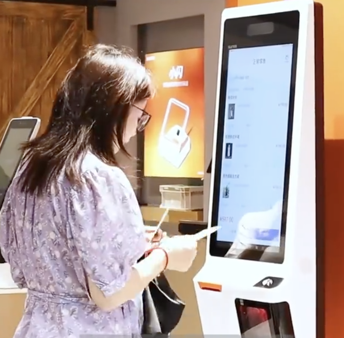 - 挑选商品后,顾客可以使用自助结账机自行结账。